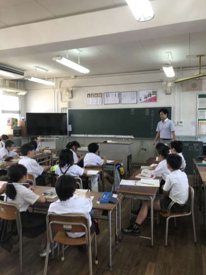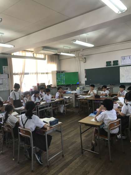 5年生は国語の授業でした。「立場を決めて討論しよう」という単元で、「宿題はあった方がいいのか」や「給食をお弁当にした方がいい」といったテーマに対して賛成・反対に分かれて意見をぶつけ合っていました。