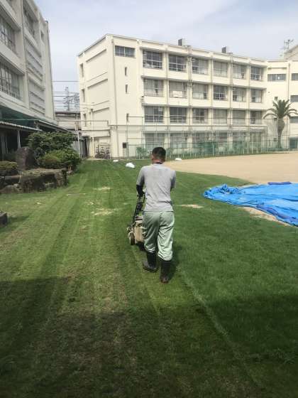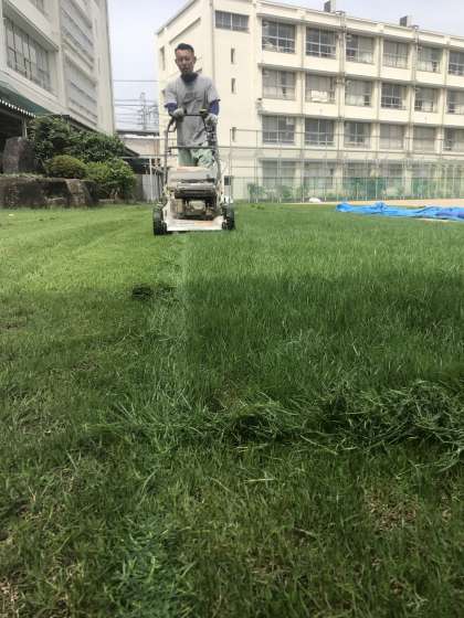 管理作業員の岡田さんが伸びてきた芝生の管理をしてくれました。辺りには芝の香りが漂っていて清々しかったです。作業を終えたときには、ふわふわの絨毯のような芝生が広がっていました。