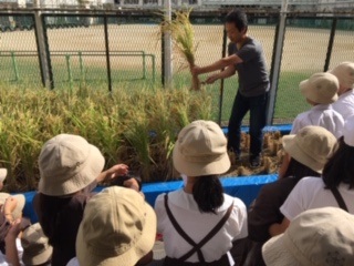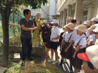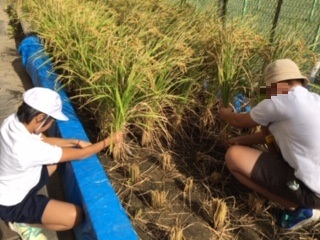 10月15日(火)に5年生が育てていた稲を刈る作業をしました。臨時講師で、「農業についてはまかせろ!」の本校職員の清水さんに安全に刈るための方法や、刈った稲の干し方について教えてもらいました。子どもたちは、自分たちが育てた稲の成長を喜びながら集中して作業をしていました。