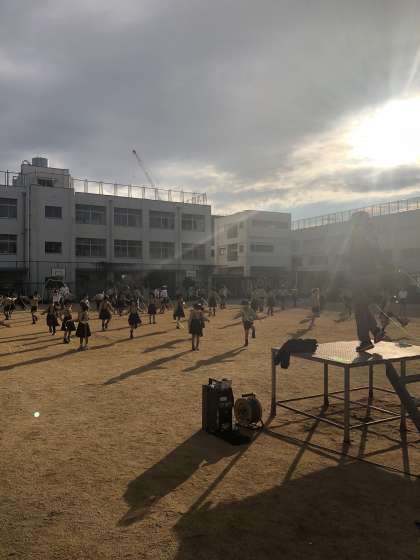 今月はなわとび集会が行われています。音楽に合わせてさまざまな跳び方に挑戦しています。今日はみんなで後ろ跳びを跳んでいました。