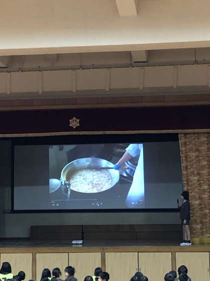 今日の集会では、給食委員会の発表がありました。給食調理員さんが給食のカレーを作る様子を、プロジェクターで映しながら説明してくれました。