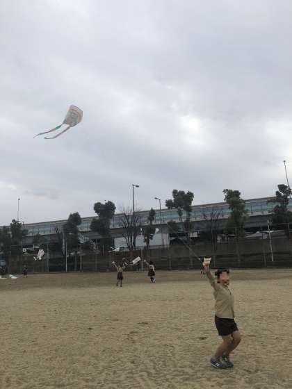 1年生が校外グラウンドでたこ揚げをしました。今日は曇ってはいましたが、気温が高く風も少し吹いていたので、たこ揚げには最適だったようです。はじめは手こずっていた子どもも、風下にゆっくりと動いた方が上がりやすいなどのコツをつかむと上手にあげることができていました。