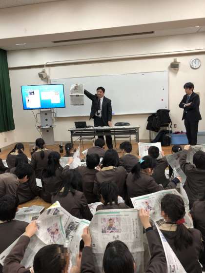 5年生が産経新聞社さんの出前授業を受けました。はじめに新聞の見方や用語(一面・見出し・コラムなど)の説明があり、実際に昨日の夕刊と今日の朝刊が配られました。その中で自分が一番気になった記事を選んで発表しました。