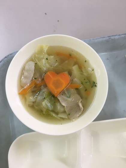 今日はおかずで豚肉とキャベツのスープが出されました。よーく見てみると、調理員さんたちの子どもたちに対する想いが見て取れます。気づきましたか?そうです!スープの中に入っている人参がハート型になっているのです。