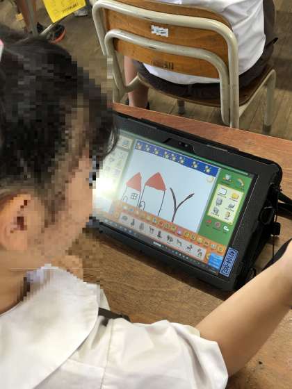2年生がタブレットを使って絵を描いたり、問題を解いたりしていました。最初は自分のパスワードを入力するのも苦労している様子でしたが、だんだん慣れていくにつれて、字の太さを変えたり模様を描いたり、楽しみながら学んでいる様子でした。