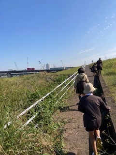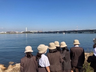 5年生は理科で水のはたらきを学習しています。今日は淀川の河川敷に行って、水の流れで地面が削られるのを守るために、どのような工夫が施されているかを学習しました。