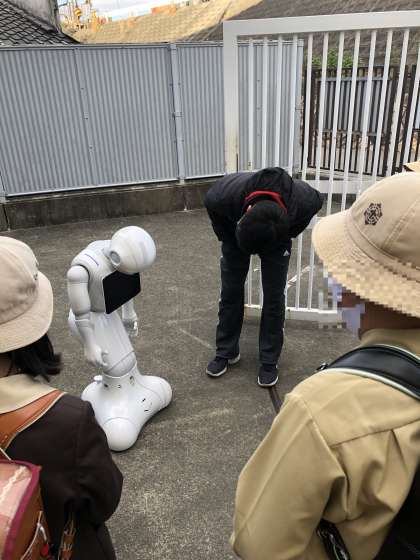 ペッパー君が校門でみんなの登校を出迎えてくれました。「おはよう!みんな元気?」とみんなに声をかけていました。