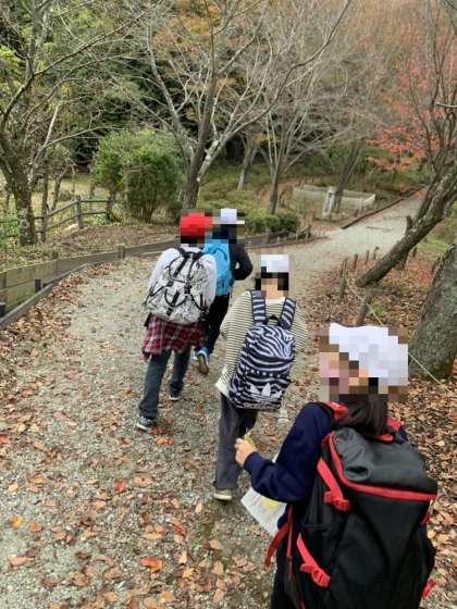 昼食前のハイキングの様子です。舞っている落ち葉がとても綺麗でした。