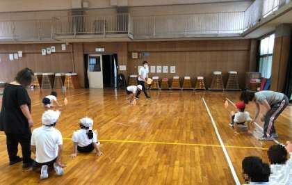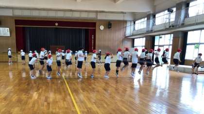 体育館では、いろいろな姿勢で体を動かしながら活動したり、多人数で大縄を跳んだりしました。どう身体を使うのか、みんなでうまく跳ぶにはどうしたらいいのかを考えながら、身体の調整力が鍛えられています。