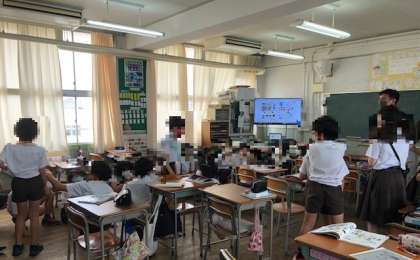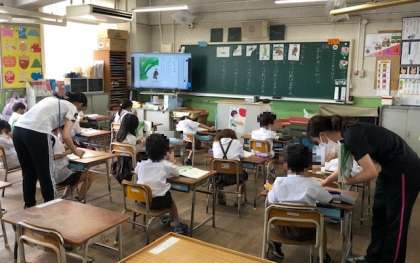 写真は、6年生の外国語と1年生の国語の学習の様子です。