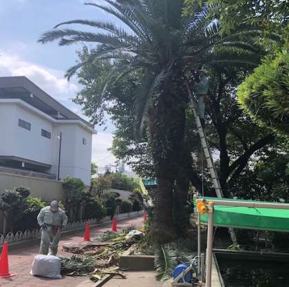 学校にある大きなフェニックスの木の枝がずいぶん伸びてきていたので、他の管理作業員さんにもお手伝いいただき、剪定作業を行いました。