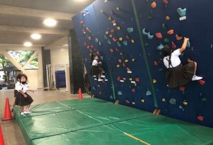 子どもたちは、運動場で遊べないので、教室で友達と過ごしたり、ピロティに設置してあるボルダリングをしながら過ごしたりしています。