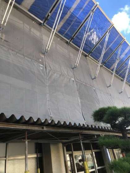 体育館の前の廊下に足場が組まれていて、廊下が少し狭くなっているところがあったり、足場の柱が立ったりしています。