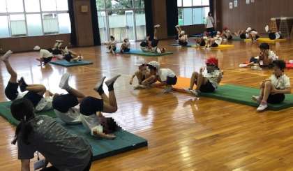 体育館では4年生がマット運動で「後転」の練習を行っていました。