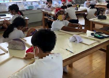 4年生は、図工で木の板を使った「コリントゲーム」を制作していました。