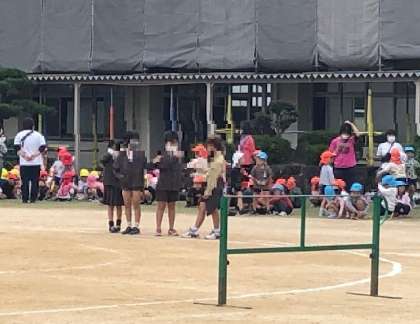 伝法幼稚園の園児のみなさんと先生方が、午前中、運動会の練習を行いました。休み時間は、児童に場所を譲ってくれています。