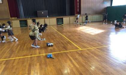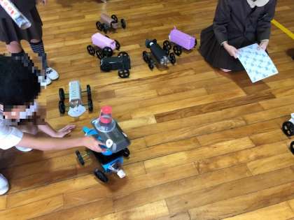 2年生が講堂で生活科で制作したおもちゃを使って学習していました。