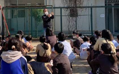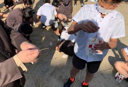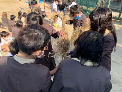 清水先生の説明を聞いて、稲刈り後に乾燥させていた稲束を配り、脱穀スタート。給食で使った牛乳パックで脱穀しました。コツをつかんでどんどん脱穀。