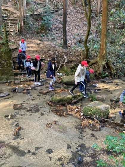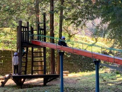 滑り台、川渡り、ロープを使った山登りなど、グループで楽しみました。自然の中に作られたフィールドアスレチックは、川のせせらぎの音を聞きながら進みます。川渡