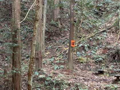 1日目の午後の野外活動は、ポイントコレクティングです。林間の各ポイントに、ひらがなが書かれた木の札がつるされています。活動班ごとに地図を読みながら、ポイントを探します。解答用紙に25箇所すべてのひらがなを書き込むと問題文ができます。それを解くために山の中を歩き回ってポイントを探しています。