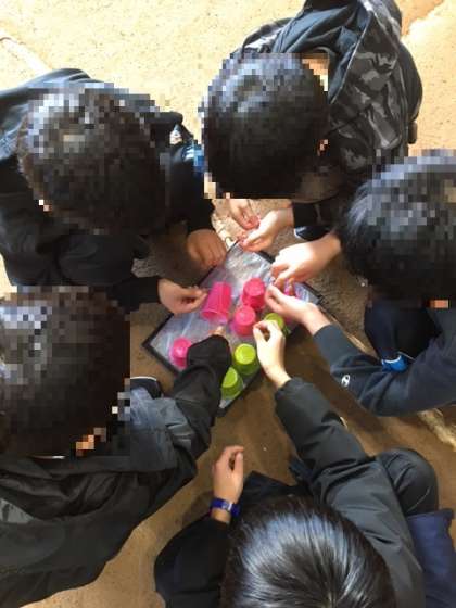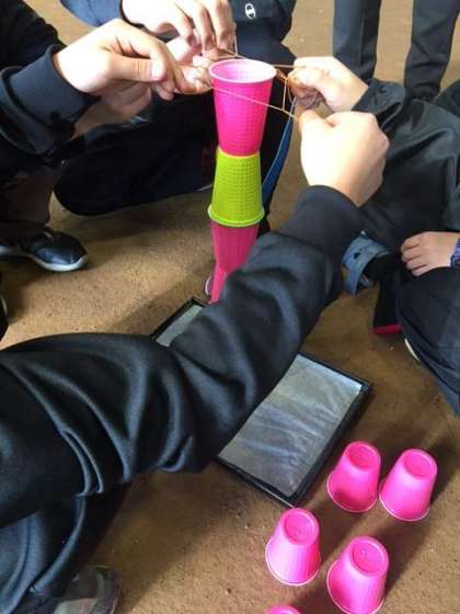 カップを直接手で掴まずに、ゴムの力を利用してカップを時間内に積み重ねていきます。チームでゴムの力加減を合わせて頑張っています!