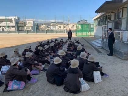 まず運動場で中学校での心得やあいさつの仕方などを学びました。