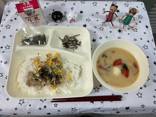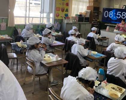 教室をのぞくと、「おもちいっぱい入ってた!」と教えてくれました。黙食ですがおいしそうに食べていました。