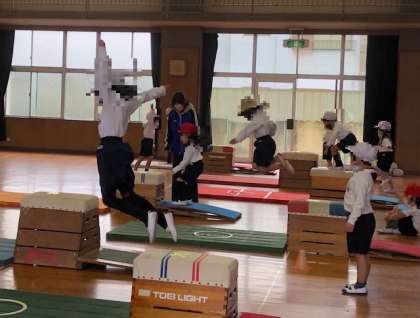 写真は、「6年生の算数」「5年生の算数」「1年生の体育」の授業の様子です。