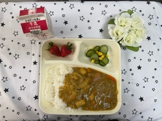 給食の様子を見に行くと、「これいつもと同じカレー?」「いつもの方がおいしい」「今日のカレーの方が好き」と色んな意見が出ていました。