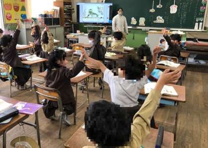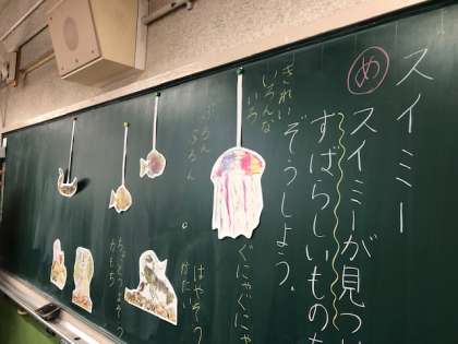 1年生が、国語科で、物語文「スイミー」の学習をしていました。この時間は、スイミーが見つけたものを考えていましたが、黒板にその絵を提示することで、より子どもたちの考えを深めることができます。