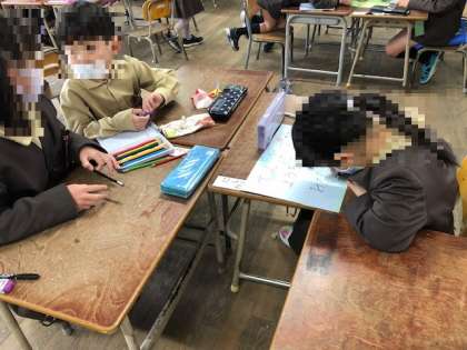 となりのクラスでは、感染症拡大の影響で、伝法幼稚園との交流ができなかったで小学校を紹介する紹介文を書いていました。来年は直接交流できるとうれしいです。