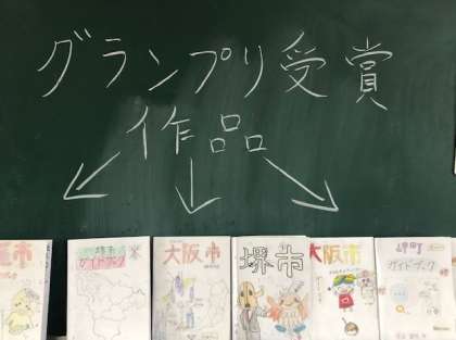 後ろの黒板には、社会科で子どもたちがまとめた「大阪府の市町村ガイドブック」が並べてありました。写真は、子どもたちがお互いに選んだグランプリですが、どれもよくまとめられていました。