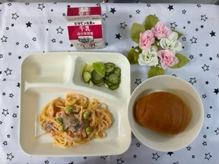 さけのクリームスパゲッティ・キャベツときゅうりのサラダ