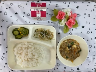 マーボーどうふ・きゅうりとコーンの甘酢あえ・もやしとピーマンのごまいため・ご飯・牛乳