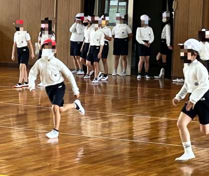 4年生は講堂で体育を行っていました。講堂せましと力いっぱい走っていました。