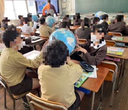 5年生が社会科で、地球儀を使って学習を行っていました。いろいろな国がどこにあるのかを確かめながら、また世界にはいろいろな国があることが分かったと思います。初めて知る国も多かったと思います。