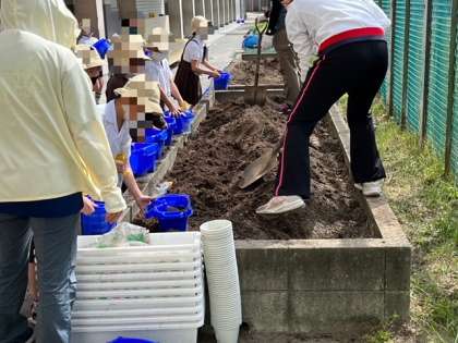 2年生は、トマトとなすの苗を植えていました。夏に向けて成長していくのが、今から楽しみですね。
