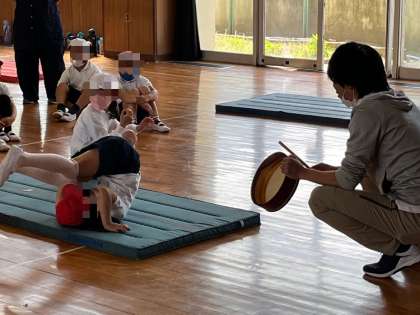 3年生は、体育館でマット運動に取り組んでいました。先生の太鼓の合図に合わせて転がったり戻ったり、リズムよく動きをつくることも大切です。