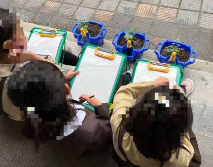 2年生は、先日植えたトマトやなすの観察をしていました。葉や茎の細かいところもよく見ながら、カードに書き込んでいました。