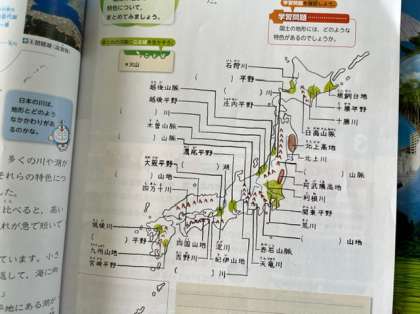 日本の国土についての学習です。日本の川や湖の特色について調べていました。世界の川と比べると、日本の川は高いところから流れていることや平野には必ず川が流れていることに気づきました。地図でみると日本にはたくさんの川や平野がありますね。
