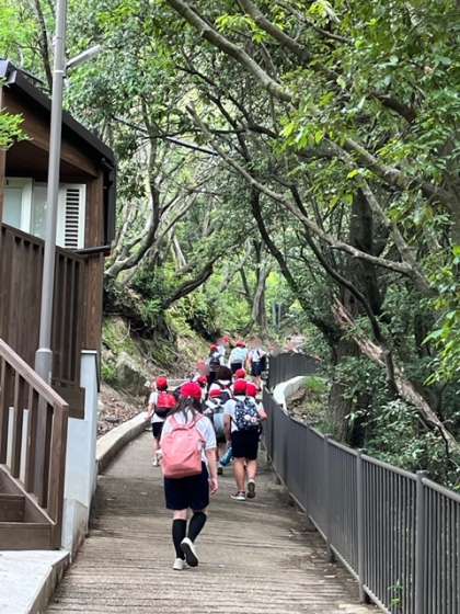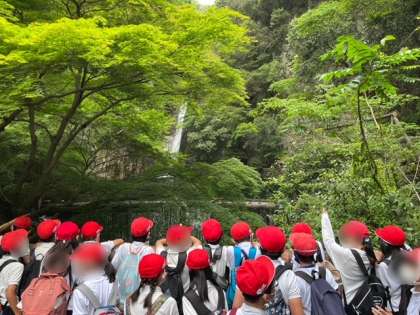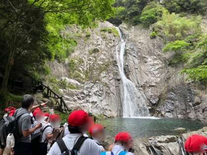 険しい山道を登ると滝が出てきました。「布引の滝」といっても一つではなく、いくつもあります。子どもたちは滝の雄大な姿を見て大喜びです。