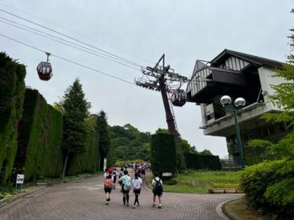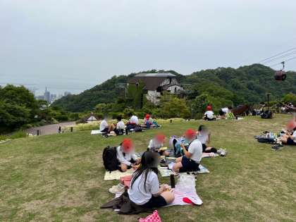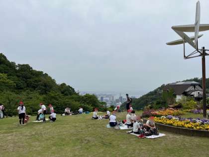 ハーブ園に到着、坂道が急でくたくたになりましたが、頂上からの景色を見ると疲れも吹き飛びました。お待ちかねのお弁当タイムです。最高の景色をバックに食べるお弁当は格別です。