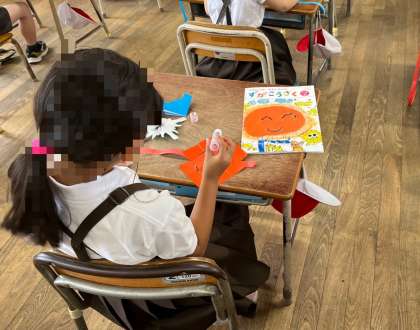 1年生は、図画工作で色紙をいろいろな形に切ったり、貼ったりしながら制作活動を行っていました。