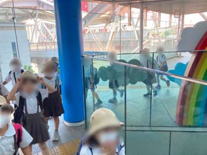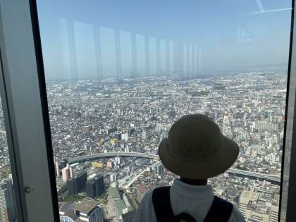 3年生は、大阪のまちのようすや土地のようすを調べるために社会見学に出発です。まずは、あべのハルカスの上から大阪のまちを見下ろしました。大阪にはたくさんの家やビルといった建物があることにあらためて気づきました。遠くの方には山も見えました。