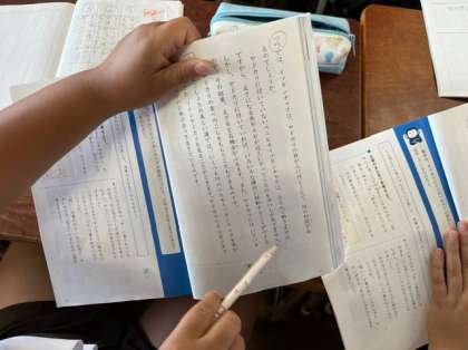 説明文「ヤドカリとイソギンチャク」を学習しています。それぞれの段落では、筆者はどのようなことを述べているのかについて、グループで話し合いました。本文をなぞりながら、「・・・だから」と自分の考えた理由を説明することができていました。