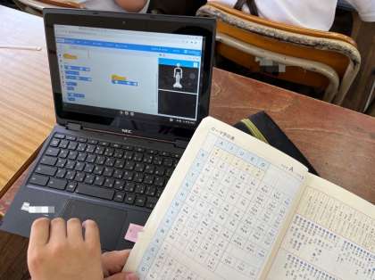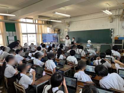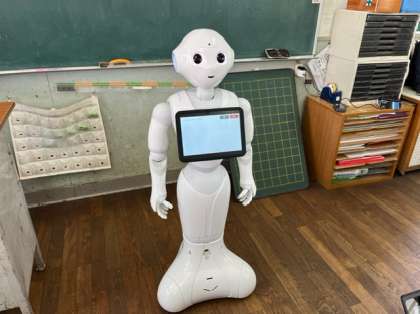 此花区役所職員にもお手伝いいただいて、プログラミング学習の始まりです。学習のテーマは、「プログラミングを使ってペッパーくんを動かそう」です。子どもたちにとってもわかりやすいように、プログラムのパーツはブロックになっています。これらを組み合わせてペッパーくんを動かしました。子どもたちは大喜びです。