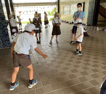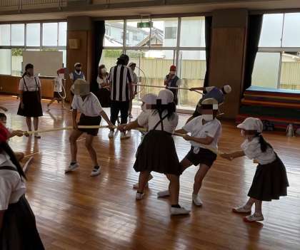 写真は「コマ回し」「ミニ綱引き」「折り紙」の様子です。