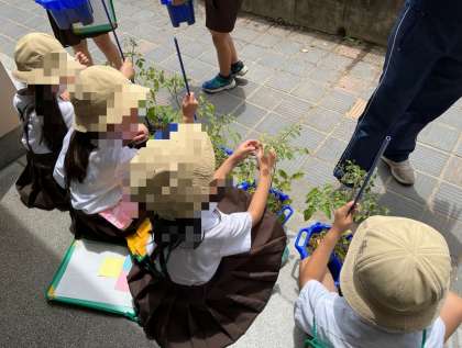 2年生はミニトマトの観察をしていましたが、ずいぶん大きくなってきたので、植木鉢に支柱を立てていました。まだ緑色ですが、いくつか実がついているものもありました。これからの成長がさらに楽しみですね。