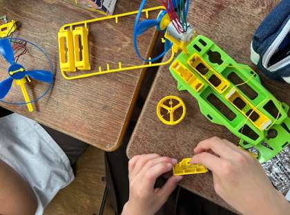電気のはたらきについて学習します。電気は、体験を通して学ぶのが効果的です。今日は、実験ができるようにキットを組み立てました。どう線を切ったり、モーターにギアをつけたり、友だちと教えあいながら実験準備をすすめました。