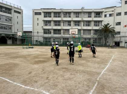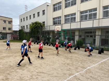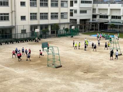 6チームに分かれてバスケットボールの試合をしています。前半と後半の間に作戦タイムをつくりました。自分たちのプレイを振り返りながら改善すると、後半はチーム全体がとても良い動きになってきました。
